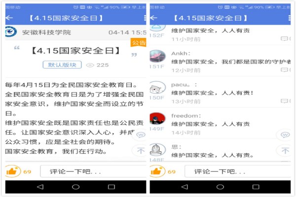 一方面是各专业班级分别优课推送《国泰民安》、《国家安全》、《 “全民国家安全教育”国家反恐办普法宣传片》等国家安全相关视频,优课材料既有寓教于乐的动漫视频,也有简短震撼的宣传材料,吸引了广大学生积极观看。通过优课学习,加深了广大学生对国家安全的理解,让同学们深刻认识到了国家安全的重要性,在学习生活工作中自觉维护国家安全。另一方面是在学院易班微社区首页推送“4•15全民国家安全教育日”微话题学习讨论。学生积极参与并纷纷点赞和评论,通过学习讨论坚定了维护国家安全的意志与决心,表达了国家安全人人有责的时代担当。