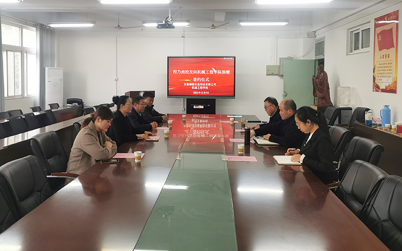 12月9日下午,机械工程学院1995届优秀毕业生、安徽顺程农业科技有限公司总经理程乃尚向母校无偿捐赠10万元,助力母校建设,充分展现了校友对母校的深情厚谊。捐赠仪式由机械工程学院党委书记姚勇主持,党委委员、副院长乔印虎、党政办主任王飞等参加。