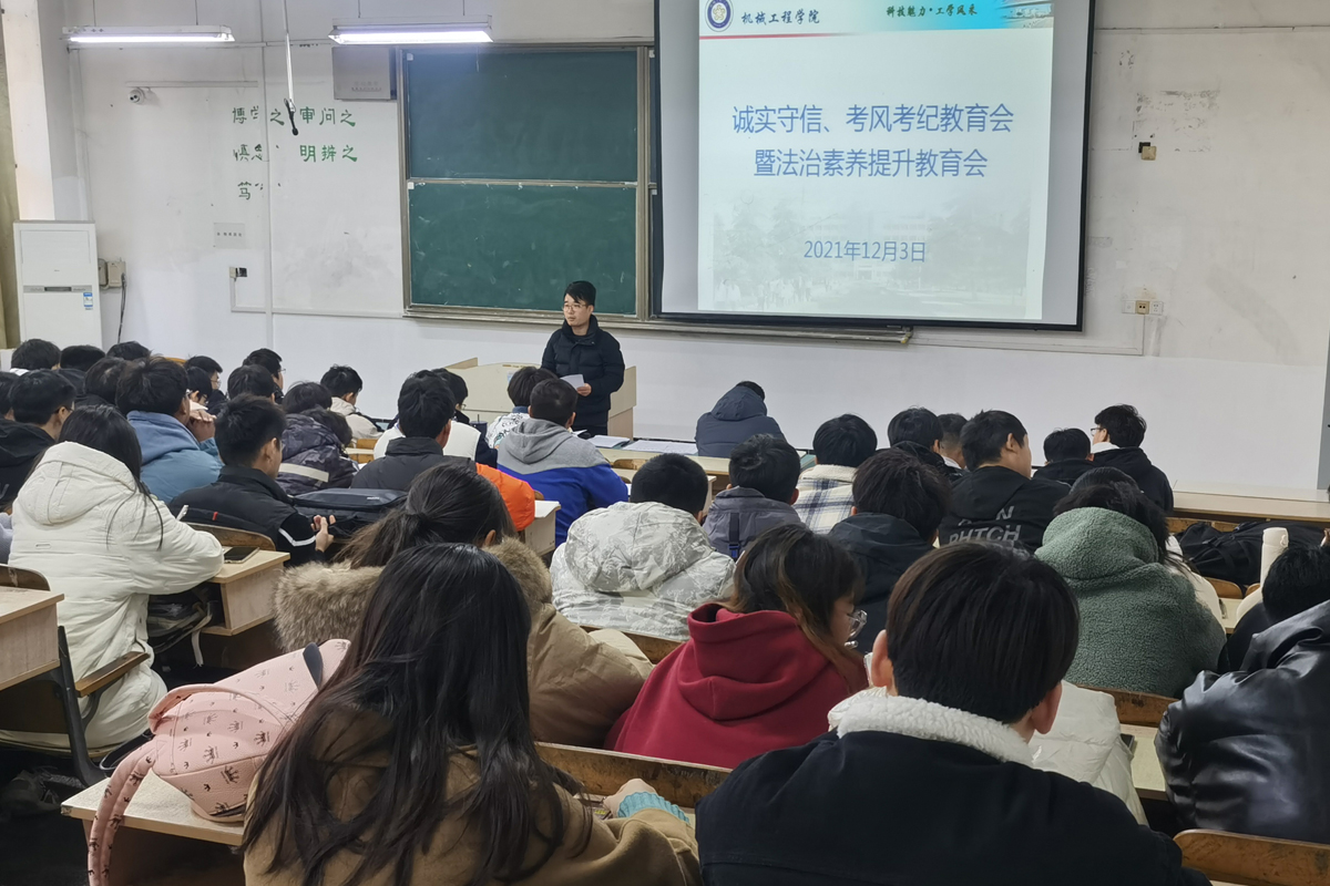 为持续推进新生入学教育系列活动,12月3日中午,机械工程学院辅导员邱杰在求知楼A101组织召开新生诚实守信教育大会,2021级新生各班班长和团支书参加会议。