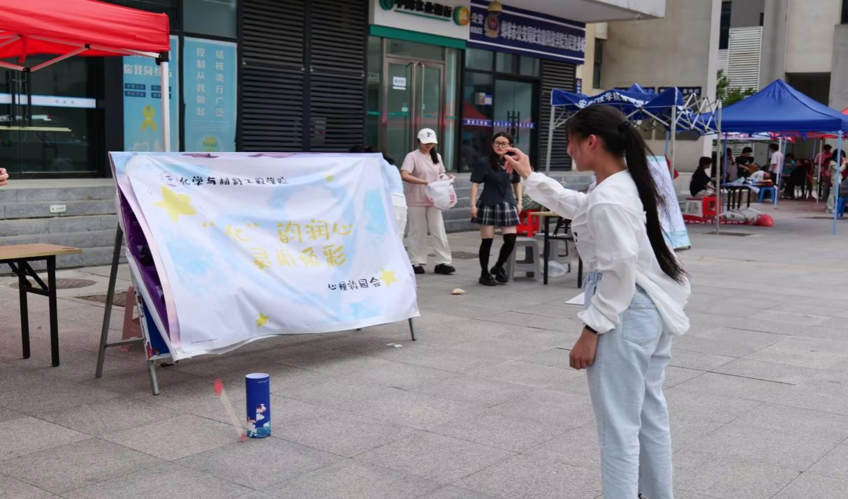 5月21日,学院在龙湖校区食堂前小广场举办了“化韵润心,灵析焕彩”主题心理游园会。活动巧妙融合化学学科特色与趣味互动设置“分子塑形”橡皮泥创作、“催化投壶”挑战赛等创意项目。同学们用五彩橡皮泥捏制各种生动形象的模型,在指尖揉捏中激发想象力;投壶活动中精准投射间笑声不断,轻松化解压力。活动现场还派发了香囊和与端午节相关的精美钥匙扣。本次游园会以学科为媒、欢乐为桥,既让同学们在协作与游戏中感受化学的灵动之美,又通过轻松互动深化朋辈联结,让积极心态如“连锁反应”般在校园中持续扩散,为心理健康教育增添一抹独特的“化材温度”。