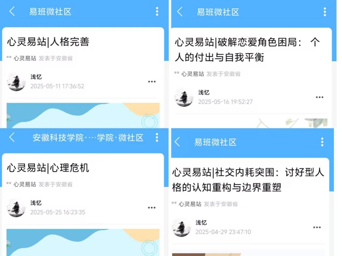 作为学院“5.25 心理健康月”的重要组成部分,线上心理知识宣传活动于近日通过易班等网络平台有序开展。活动期间,学院依托易班 APP “心灵易站” 及官方微信公众号,定期发布一系列心理健康科普推文,内容涵盖情绪管理技巧、压力应对策略、心理现象解析等多个维度,通过案例分析与实用方法结合帮助学生提升心理自助能力。同时,平台同步发起“心灵树洞”互动话题,鼓励学生匿名分享内心困惑或温暖故事,形成 “线上共话心理” 的热烈氛围。