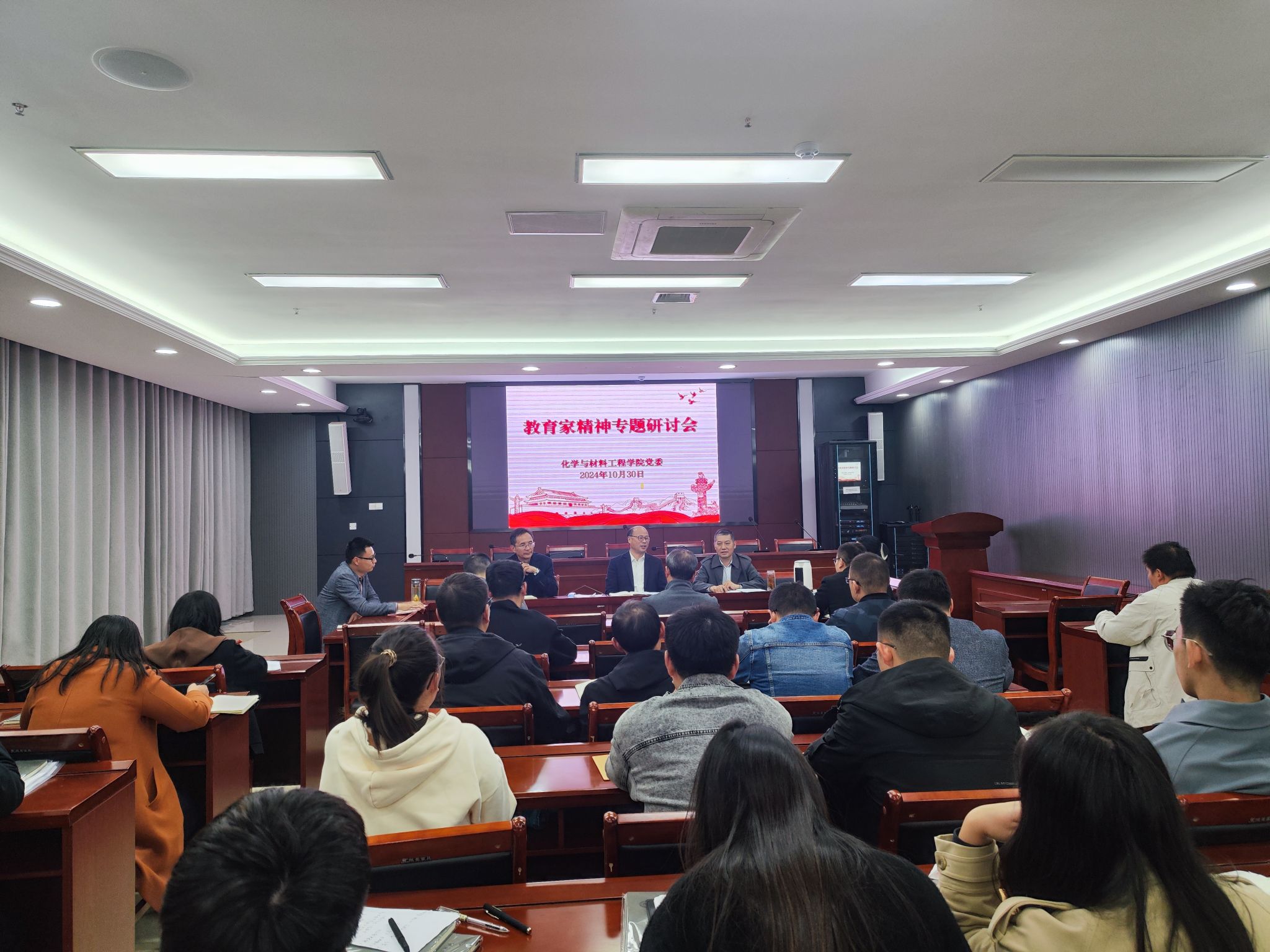 10月30日下午,化学与材料工程学院在西辅楼111会议室召开教育家精神专题学习研讨会。校党委委员、副校长王孝义莅临指导。研讨会由化学与材料工程学院党委书记黄树桥主持。学院全体教职工参加会议。