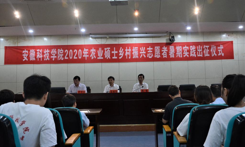7月26日上午,我校“弘扬安科精神 助力乡村振兴”2020年农业硕士乡村振兴志愿者暑期实践出征仪式在图书馆一楼报告厅举行。校党委书记蒋德勤,党委副书记、校长李震,党委委员、副校长李升和出席仪式,各研究生培养学院负责人、带队教师和全体研究生志愿者参加出征仪式。出征仪式由李升和主持。