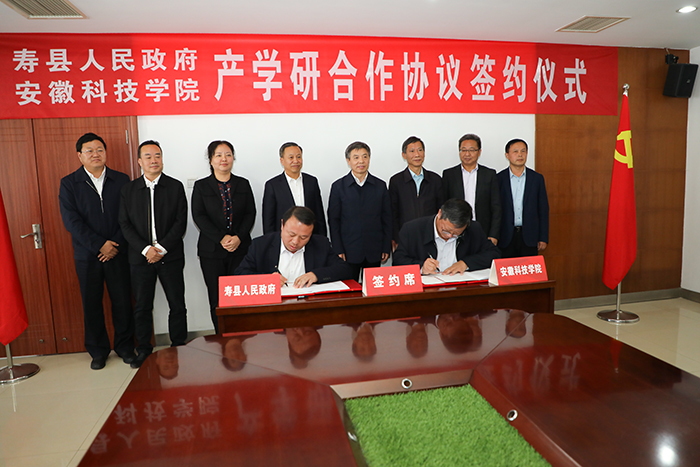 10月29日,学校与寿县人民政府在图书馆九楼会议室签订产学研合作协议。校党委书记蒋德勤,党委副书记、院长李震,党委委员、副院长李升和,寿县县委书记牛方括,县委副书记、县长孙奇志,县政协主席朱勇,县委常委、组织部长洪毅然出席签约仪式。仪式由李震主持。