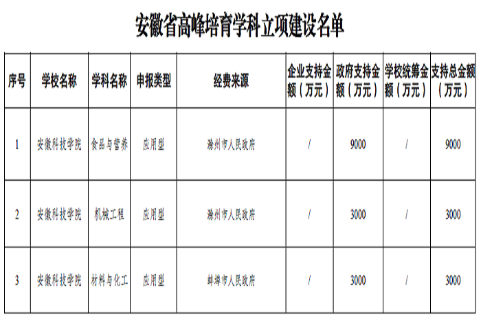 今年二月,《安徽省教育厅关于立项建设高峰培育学科的通知》公布,我校3个学科进入安徽省高峰培育学科建设名单,学科建设获得新突破。其中,食品与营养作为Ⅱ类高峰培育学科进行建设,机械工程和材料与化工作为Ⅲ类高峰培育学科进行建设。