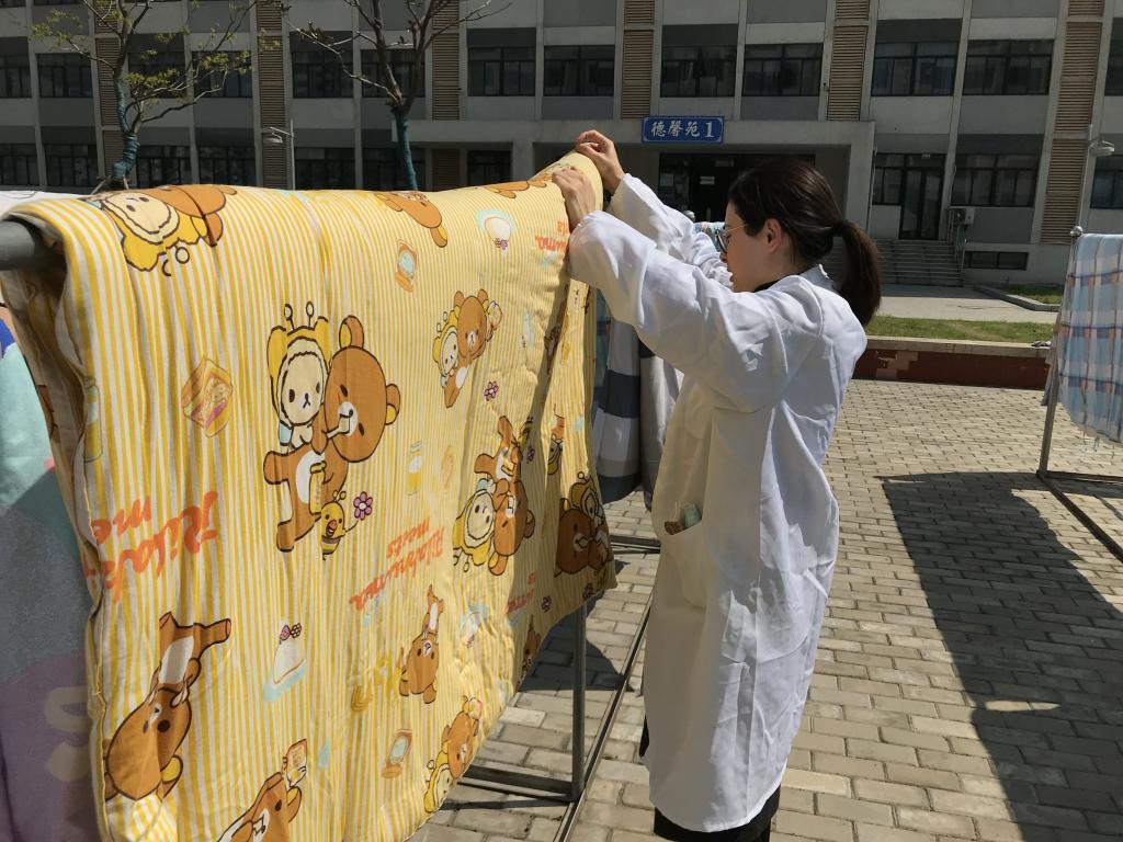 女老师们一边搭被子,一边随手拍去被子上的灰尘,张雪梅老师脸上露出了妈妈般的笑容:“这种感觉就像是在给我家女儿晒被子,盖着香香的被子就不想家了”。陈俊明老师则一边快速地将被子搭在自己身上,一边催其他老师加快动作,想让被褥争分夺秒地多晒会“日光浴”。丁志杰老师则一边将轮流将被子们翻面,一边说:“现在疫情严重,两面都要晒到才能杀菌更健康。”
