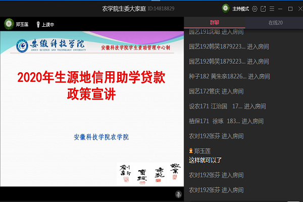 为了全面宣传国家、学校有关学生资助政策,帮助同学们及时了解助学贷款政策,实现应贷尽贷、应助尽助目标,保障学生在校期间安心读书、无负担读书,6月4日下午,农学院通过QQ群课堂举行资助“两节课”之生源地信用助学贷款政策宣讲会,农学院全体生活(资助)委员和学生会生活部同学参加会议。农学院辅导员郑玉莲担任主讲。