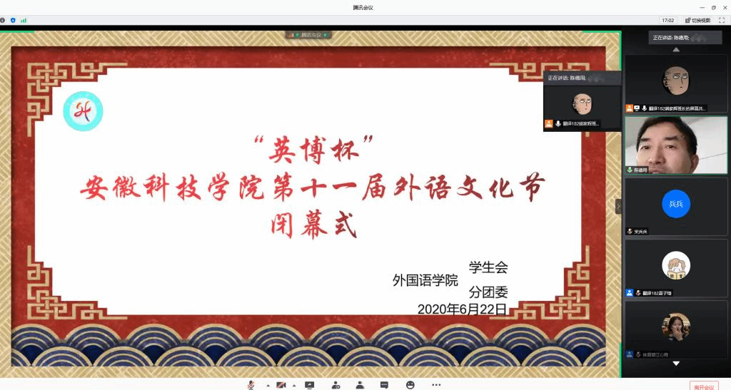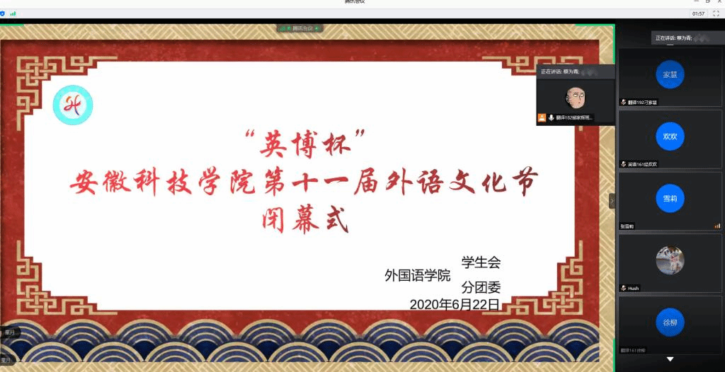 6月22日晚上,外国语学院在腾讯会议隆重举行“英博杯”欧亿官方网页版第十一届外语文化节闭幕式。校党委委员、宣传(统战)部长卫胜,校团委书记黄立义,外国语学院院长陈德用、党总支书记蔡为青、副院长刘萍及部分老师出席“线上”闭幕式,学院大部分学生参加闭幕式,闭幕式由蔡为青主持。