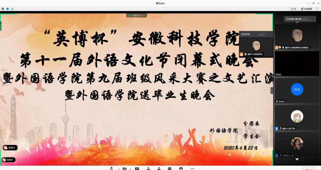 6月22日晚,外国语学院在腾讯会议上举行了“英博杯”欧亿官方网页版第十一届外语文化节闭幕式晚会暨第九届班级风采大赛文艺汇演暨送毕业生晚会。外国语学院院长陈德用、党总支书记蔡为青、副院长刘萍及师生代表参加。此外,班级风采大赛文艺汇演邀请动物科学学院学生会主席孙静、资源与环境学院学生会主席吴柳莹、人文学院学生会主席徐鹏飞,外国语学院六届二任学生会主席杨妍,英语162班班长张寻、外国语学院六届一任学生会文艺部部长宫思远、翻译161班团支书陈慧仁7名同学担任评委,晚会由英语182班刘珍珍和翻译182班胡玉辰2位同学主持。
