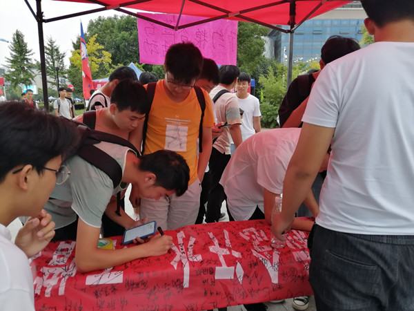 此次签名活动在学校西区广场和东区同时进行。9月25日上午10时,签名活动准时开始,西区广场早已聚集了大批签名的同学。随着活动的进行,前来签名表达对珍惜粮食活动支持的同学越来越多,在现场学生工作人员的组织下,签名活动秩序井然。而在东区,参与签名的同学更是络绎不绝。活动开始后半个小时,横幅上的签名便已是密密麻麻,更有同学写上了“以吃‘光’为荣”的幽默而又有力的呼吁口号。在全校师生的热情参与下,下午6时左右,此次签名活动圆满落下帷幕。