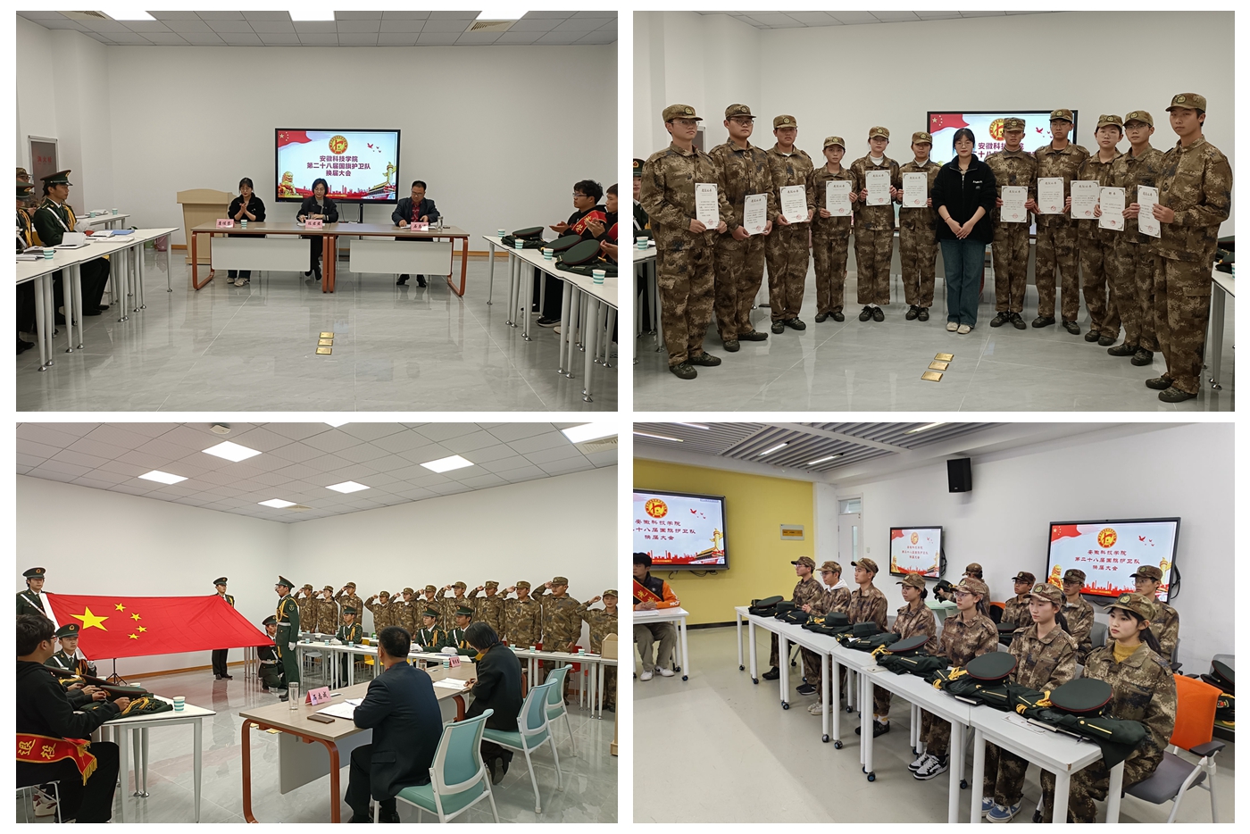 11月22日,我校国旗护卫队分别在龙湖校区学生一站式服务社区二楼会议厅和凤阳校区求知楼307智慧教室举行换届大会。党委学工部副部长、学生处副处长陈君君出席并指导,学生处相关教师受邀参加,校国旗护卫队第28届全体成员和第27届退役队员近百名同学参加换届大会。换届大会由党委学工部秘书、校国旗护卫队指导老师石志成主持。