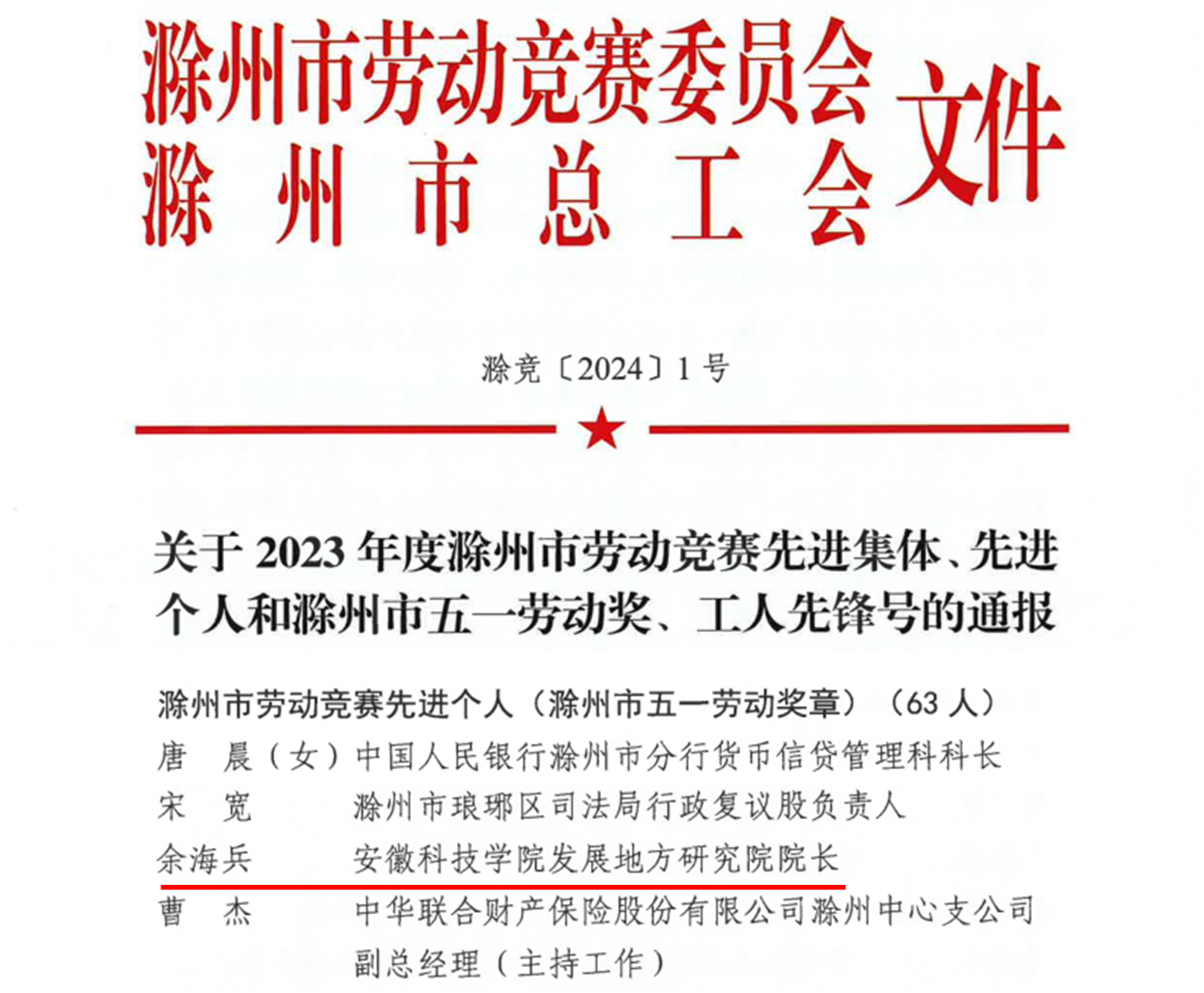 4月29日,滁州市劳动竞赛委员会、滁州市总工会公布了2023年度“滁州市五一劳动奖章”获得者名单,经南谯区科创城提名推荐,我校农学院教师余海兵教授获此殊荣。