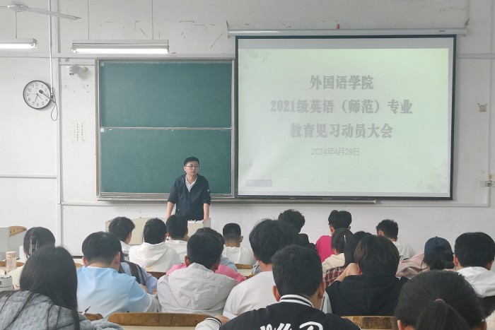 为扎实做好2021级英语(师范)专业见习工作,引导学生以良好的精神风貌迎接见习,4月29日下午,外国语学院在求知楼A203教室举行2021级英语(师范)专业教育见习启动大会。2021级英语(师范)专业全体学生参加本次会议。外国语学院党政领导和有关教师出席会议,会议由学院副院长洪民主持。