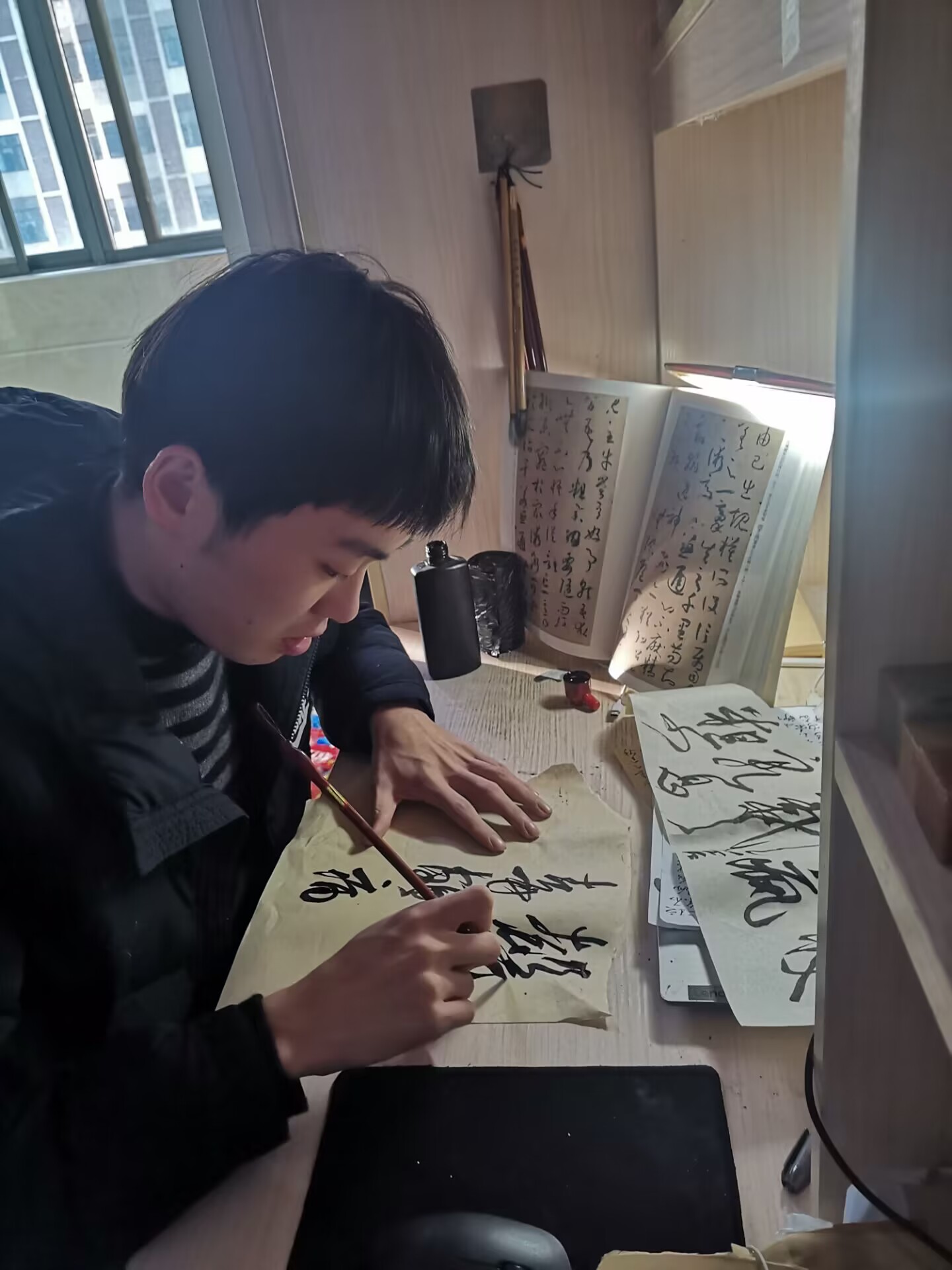 陶乐乐对学习充满热情,善于钻研,乐于将所学的知识融汇贯通并总结出一套自己的学习体系来丰富自己的学识境界。他具有丰富的想象力和创造力,在团队设计专利“数字化供水业务服务平台”的过程中,他提出了用“高斯曲线模型”和“数学方位视角”来解决其中一项有关客户体验感提升方法的问题。他曾以个人名义参加了“第二届安徽省大学生品牌创意设计大赛”A类赛事,并取得了省一等奖。他还十分痴迷于书法艺术,尤爱晋唐时期的潇洒书风。在任职“欧亿官方网页版书美协会副会长”期间,他举办了书法知识竞赛、书法创作分享大会、书法艺术展等多项活动,除此之外,他还计划申请加入中国书法协会。