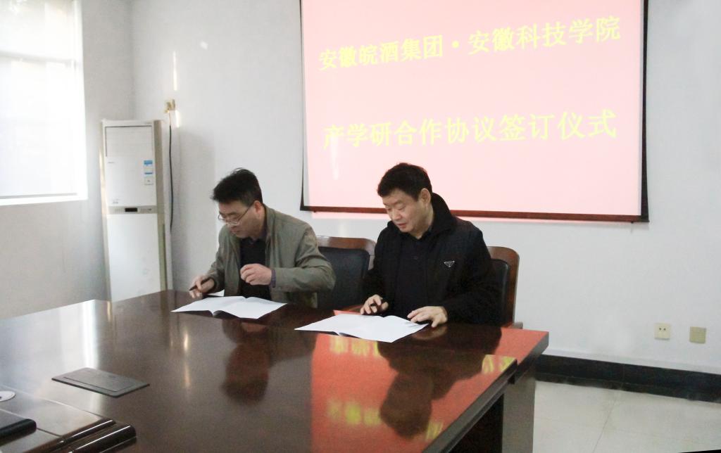 赵伟峰等在陈翔总经理的陪同下,首先参观了皖酒集团的企业博物馆和产品生产线,了解皖酒的制作酿造工艺流程,并深入探讨了在企业发展中存在的主要问题。随后,赵伟峰与皖酒集团总经理陈翔签署了产学研合作协议,并就双方未来在师资培养、学生实习、企业培训、项目合作等具体合作事项展开讨论和设计。