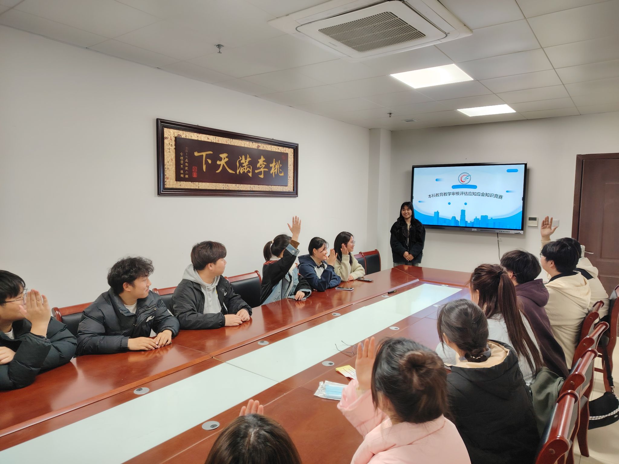 活动伊始,江旭聪简要介绍了新一轮本科教育教学审核评估的相关背景和学校、学院方面正在开展的一些工作。随后,活动进入知识竞答环节,竞赛采取“快问快答”形式,主持人通过PPT设置《应知应会知识手册》中相关问题,同学们可现场举手抢答,抢答成功按积分高低可获取小礼品。比赛过程紧张有序,竞赛现场气氛热烈,同学们以饱满的精神面貌沉着应对、踊跃抢答,充分展现了管院学子对学校本科办学发展的关心关注,也让同学们感受到知识与趣味相结合的魅力,在新颖的活动形式中对新一轮本科教育教学审核评估知识有了更深入的了解。