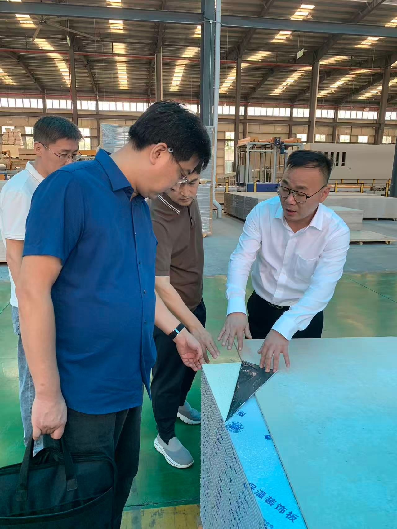 会后,吴伟东一行在张怀东等的陪同下,参观了建筑防火保温一体化板材生产车间。在近7万平米的生产车间内,原材料从初步加工蒸养到上色镀膜,环环相扣,自动化生产程度高,经检验合格的产品源源不断地运送到全国各地。