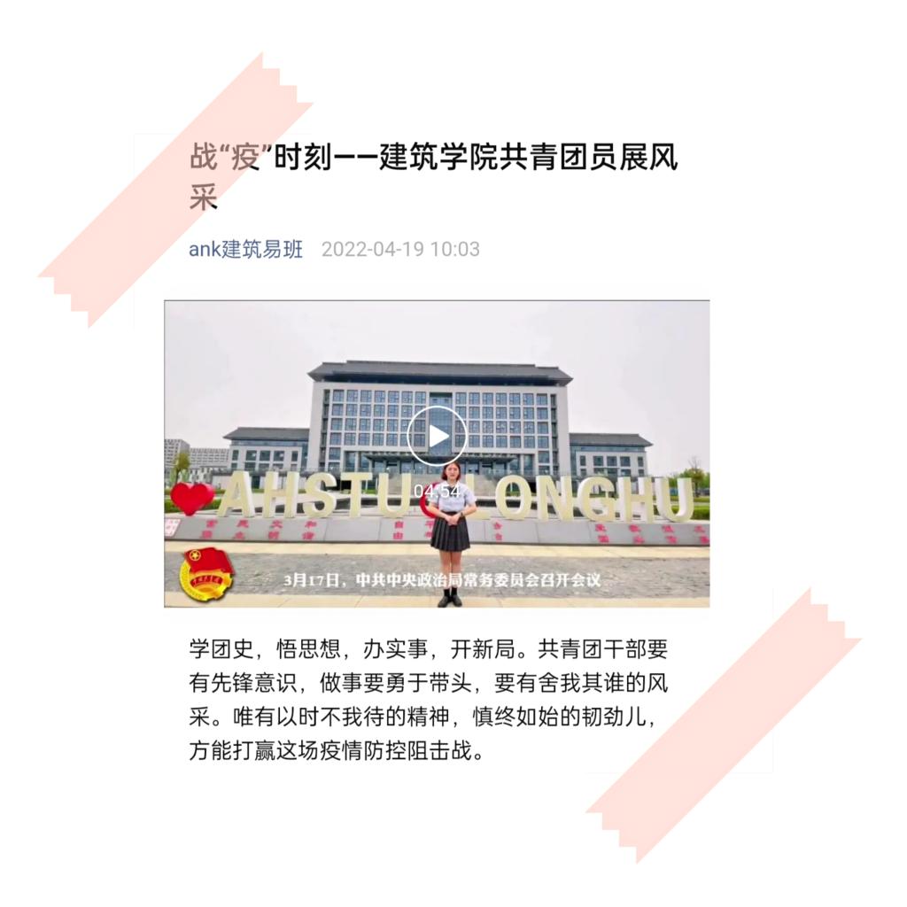 团支部录制的《战“疫”——共青团员的中坚》视频,充分体现了广大团员青年在疫情防控阻击战中贡献青春力量的热情和决心。视频中,张雨欣同学就当下疫情形势进行了系统地讲解,她号召全体共青团员要发挥党的助手和后备军作用,带领班级学生积极作为。罗志娟同学讲述了疫情防控期间建筑学院学子积极参加劳动实践、体育锻炼和文化活动,号召广大青年继续争当表率,以实际行动坚定战胜疫情的决心和勇气。该视频在欧亿官方网页版建筑学院易班微信平台发布后,反响良好,得到师生一致好评。