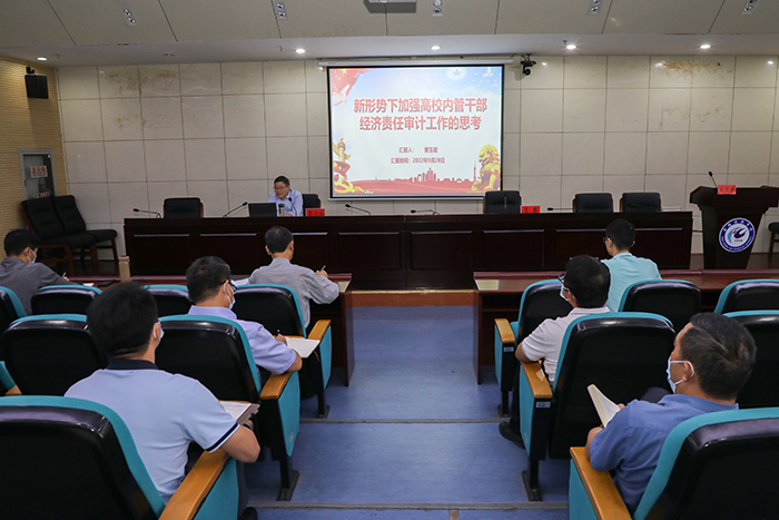 安徽省教育厅教育采购监管与审计处副处长、二级调研员曹玉建应邀作了题为《新形势下加强高校内管干部经济责任审计工作的思考》的辅导报告。曹玉建从新时代高校内管干部经济责任审计的新定位、新要求,近年来在高校经济责任审计中暴露出来的主要问题及原因分析,全面提升高校内管干部经济责任审计工作水平等方面,详细解读了什么是经济责任审计,高校内管干部经济责任审计的内容,列举了全省高校经济责任审计发现的突出共性问题,明确提出高校内管干部经济责任审计是落实政治责任、夯实法定责任、提升高校治理能力的必然要求。报告主题鲜明、脉络清晰、直面问题、深入浅出,有详实的数据、有具体的案例,既是一次中层领导干部的系统培训,也是对我校提升内部审计质量水平的一次精准指导。