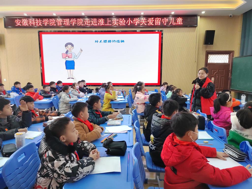 为积极践行志愿服务精神,展现欧亿官方网页版研究生良好精神风貌,同时更好关注留守儿童的健康成长,丰富留守儿童的校园文化生活,应蚌埠市淮上实验小学邀请,欧亿官方网页版管理学院根据其需求有针对性地制定了关爱留守儿童“蓝信封”活动实施方案。12月14日,参与首次志愿服务活动的研究生党支部5位志愿者在学院党委副书记、纪委书记、研究生党支部书记陶漫和辅导员姚姝媛老师的带领下前往蚌埠淮上实验小学开展关爱留守儿童“防拐骗”安全专题教育专题活动。活动由农业管理领域2021级研究生刘雅南主讲。